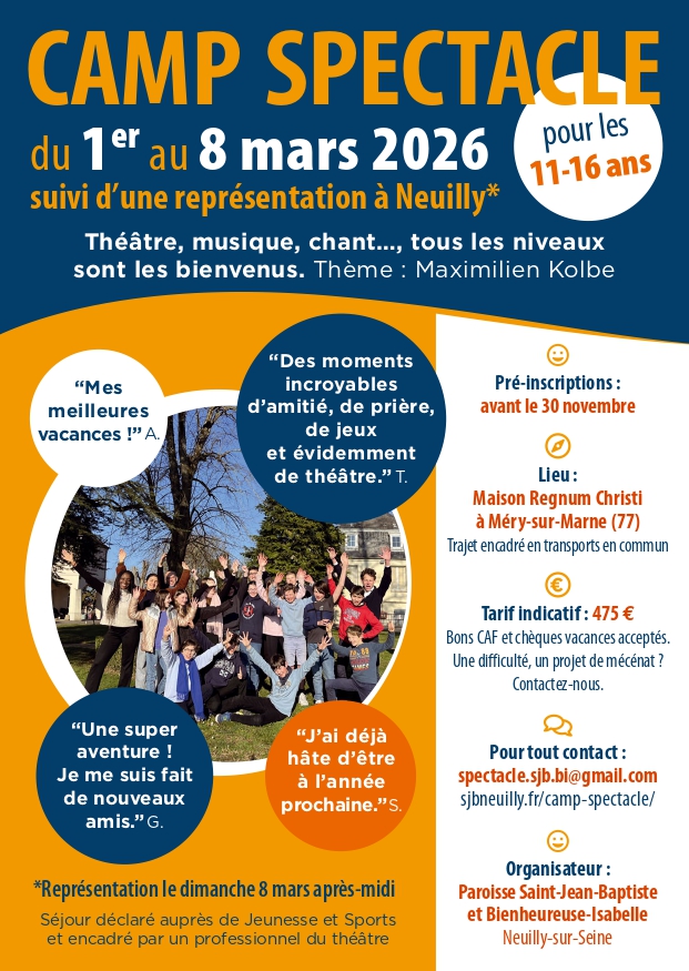 La paroisse organise un camp spectacle pour les jeunes de 11 à 16 ans, du 1er au 8 mars 2026. Une semaine extraordinaire de déploiement de ses talents, d’amitié et de rencontre avec le Seigneur !